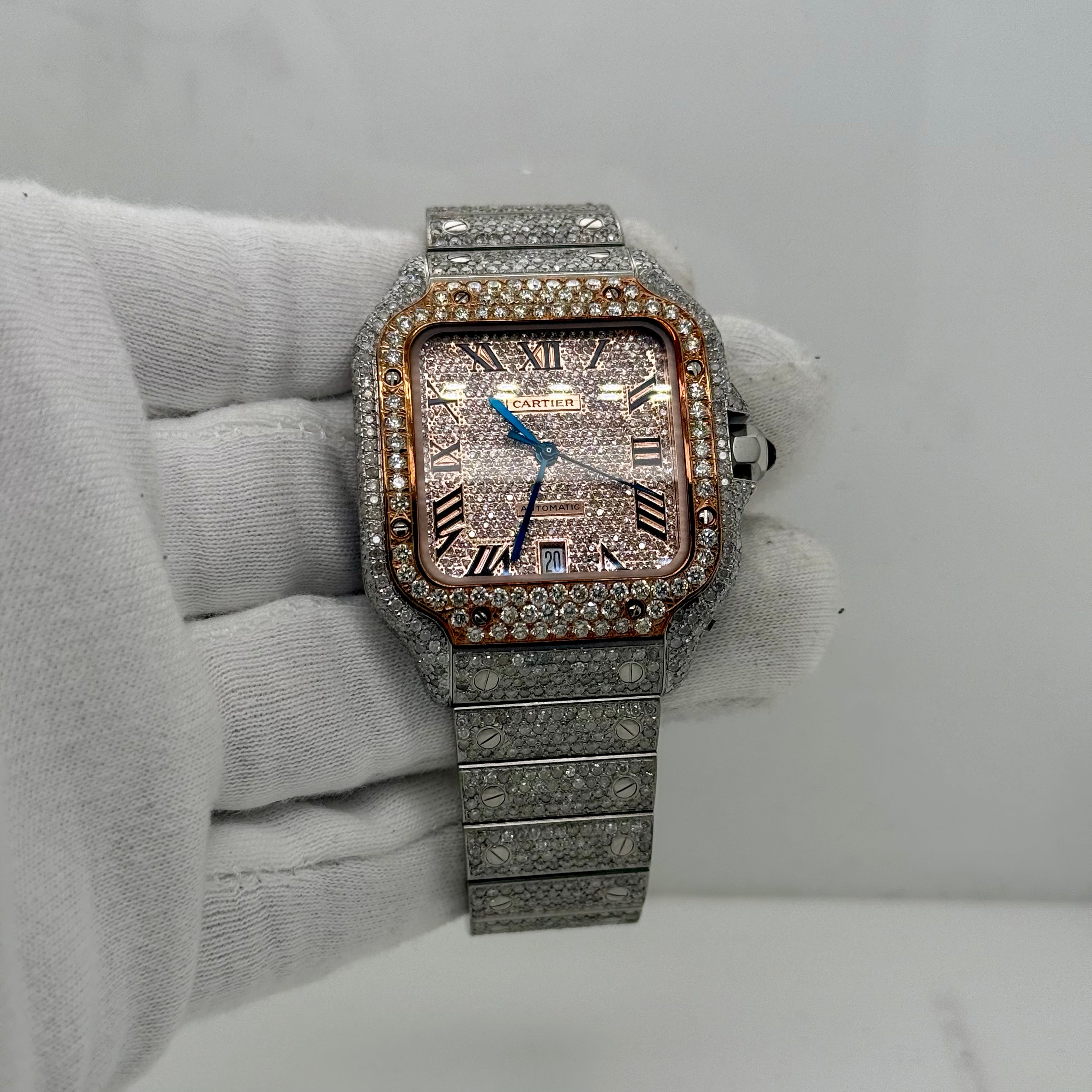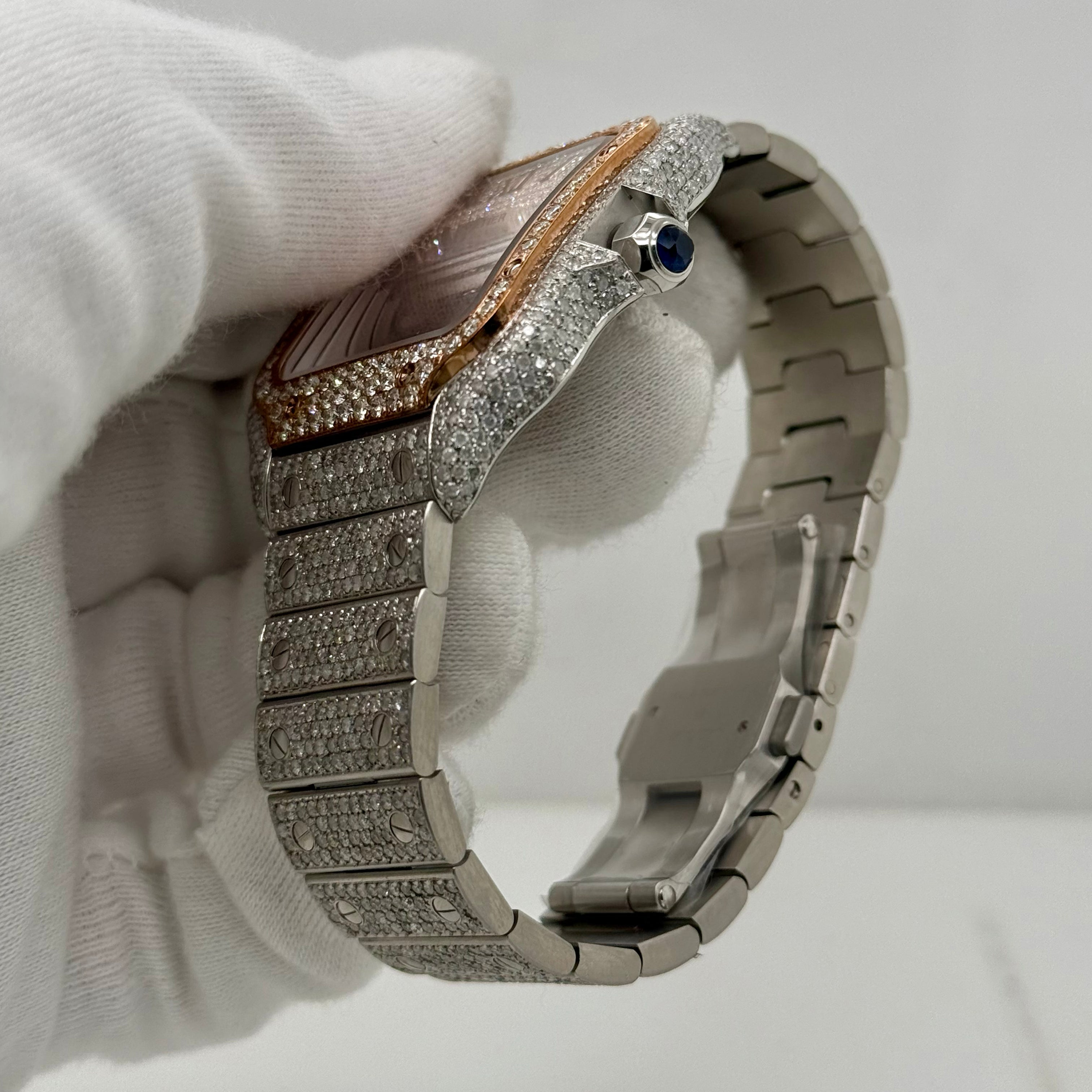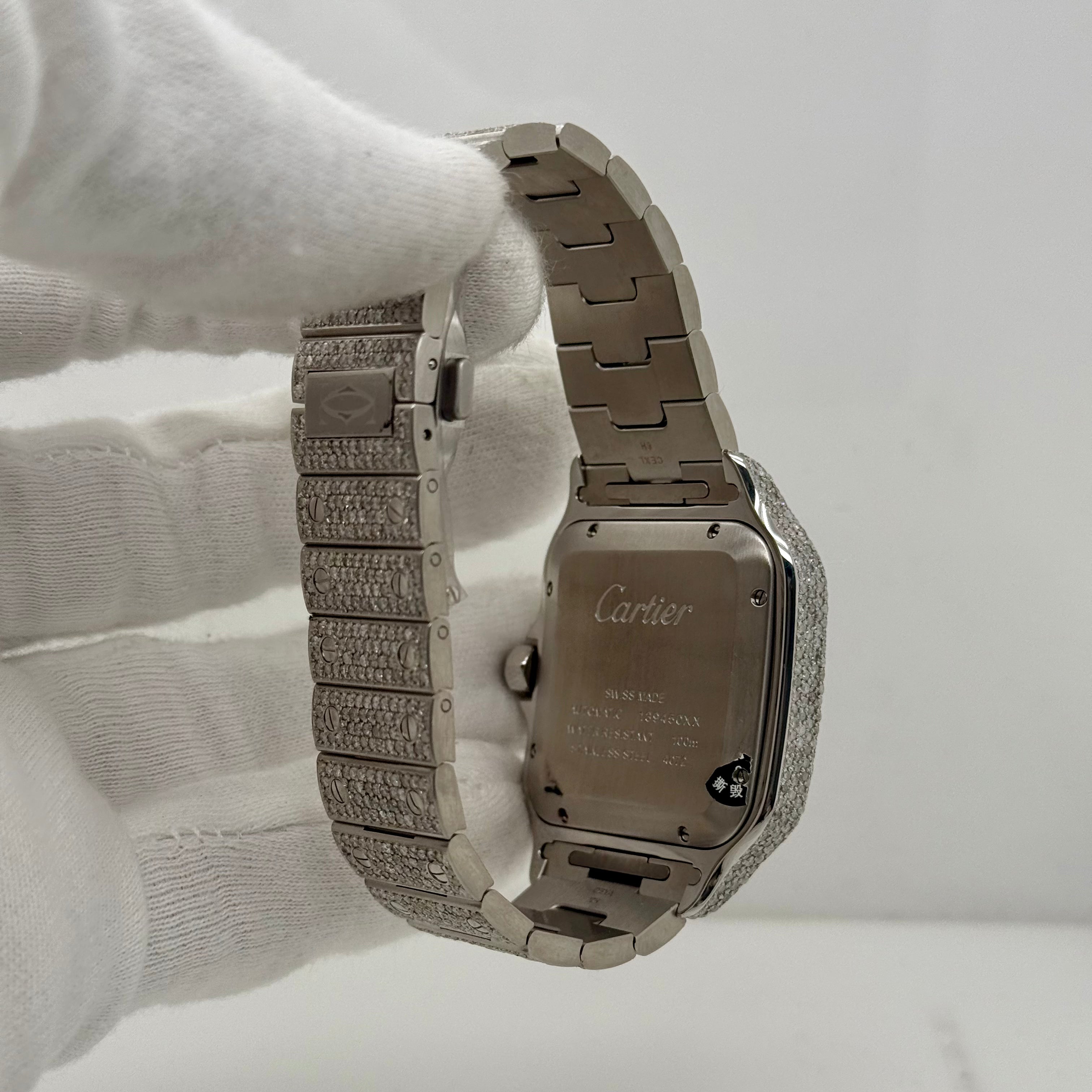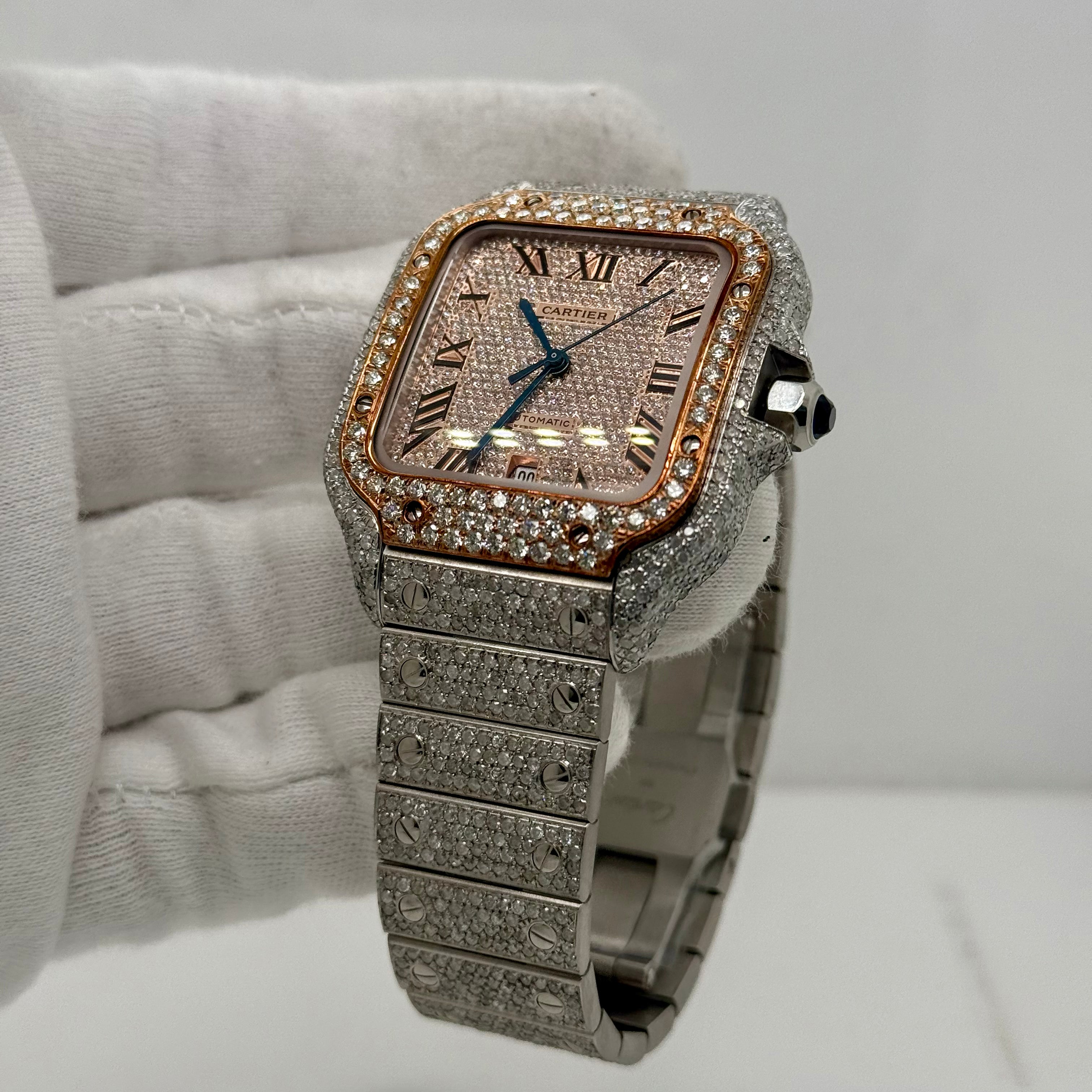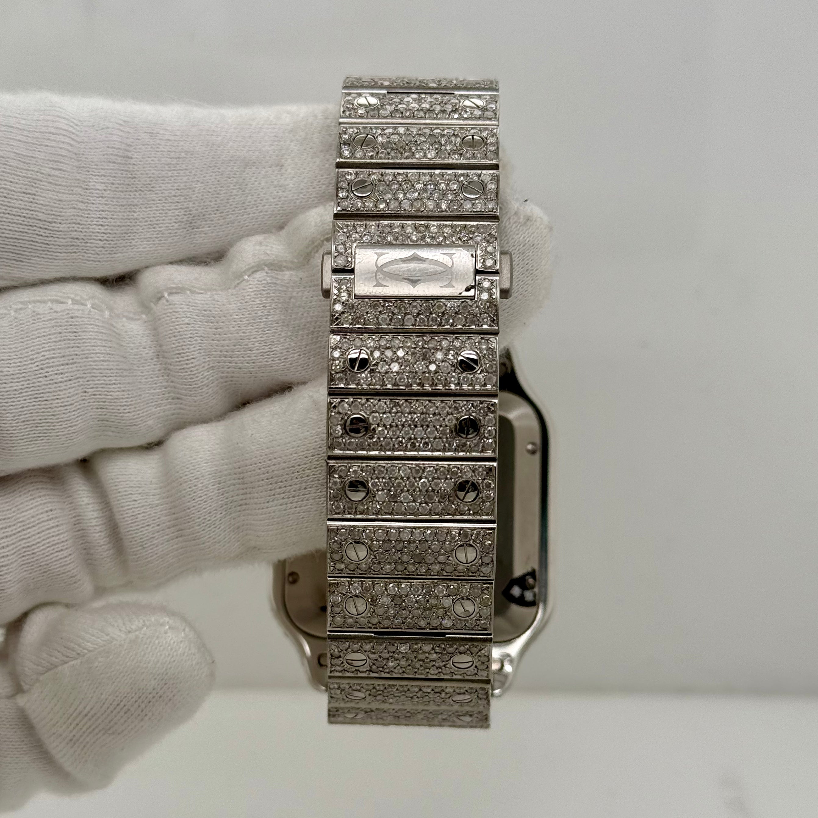 This Cartier Santos 40mm takes a classic shape and turns it all the way up. Fully iced out with natural diamonds on the case, bezel, and bracelet, it catches light from every angle. The square face and exposed screws keep that signature Cartier feel, but the diamonds give it a loud, modern edge.